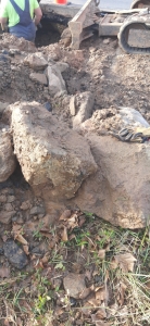 Once the pipe was exposed, crews found a circular break on a six-inch transmission main. The leak was estimated at approximately 100 to 150 gallons per minute. During excavation, crews also discovered three fiber-optic cables and a natural gas transmission line located only inches above and beside the water main making digging with an excavator extremely difficult and potentially hazardous.